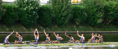 レース折り返しの1000m地点を過ぎると、コックスやクルーのリーダーがレース展開をみながら先頭争いをします。この地点では1艇身(2~3秒)程度の差はまだまだ射程距離。レースが動くのは1400m地点以降です。残り2分弱の距離になると一気にレーススピードが上がります。この地点までいかに体力を温存してトップ争いをしてきたかが問われます。この地点からが本当の勝負、ラストスパートです。1700m以降、1分近いロングスパートをするクルーもあります。まさに死力を出し尽くし、トップをとるための意地のローイングが見られます。