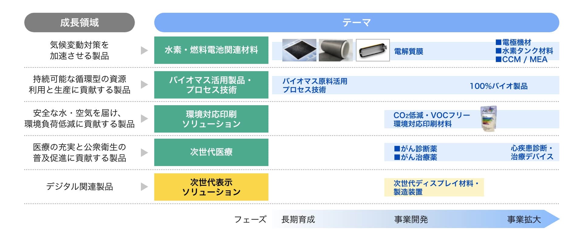 これらの成長領域には、設備投資と研究開発費を合わせて4,500億円のリソースを投入し、組織横断の体制構築を行い、お客様に対する総合的なソリューションの提案、社外連携等を加速させて、連結売上収益のほぼ6割を占めるまでに拡大させる計画です。