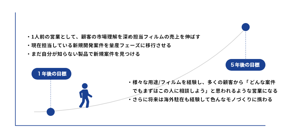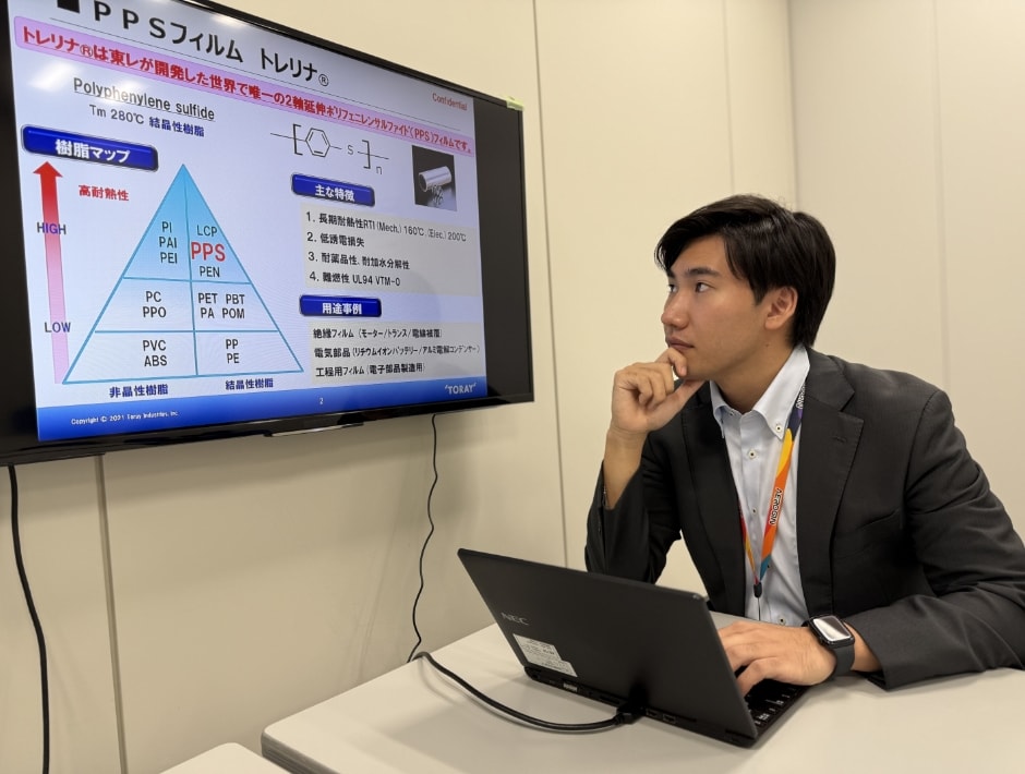 アラミドフィルム“ミクトロン”とPPSフィルム“トレリナ”の営業担当をしています。営業の主な業務は①担当顧客への販売/市場動向の分析(既存顧客の購買担当や営業担当との仕事)②新規案件の探索と開発(既存/新規顧客の開発者や営業、自社の開発者との仕事)③販売後の品質対応(既存顧客の技術者、自社の技術者との仕事)等で、色んな人達と一緒に働いています。