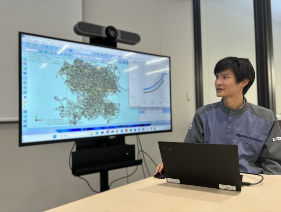 東レの信念である「素材には社会を変える力がある」に魅力を感じたからです。大学院で高分子物理の基礎研究に携わる中で、将来生まれる数万の研究の土台を築いていることにやりがいを感じていました。そこで卒業後は、製品の元となる素材から社会に貢献したいと考え、同じ信念を掲げている東レで働きたいと考えました。
