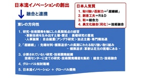 当社の研究・技術開発の基本思想は、日本人の気質をフルに活かした、日本流イノベーションの創出です。まず一つ目は、研究・技術開発を軸とした長期視点の経営、基礎研究を重視する風土、人事施策では、研究者の自由裁量による、いわゆる、アングラ研究の推奨など。二つ目は、まさに超継続とも言える、先端材料・極限追求への粘り強い取り組み、三つ目は、当社は技術センターに、全ての事業分野の研究・技術開発機能を集約しており、分断されていない研究・技術開発組織による、総合力の活用と技術融合です。また、グローバルな知財戦略、そして、日本流イノベーションとグローバル開発の融合によるグローバルな事業拡大です。