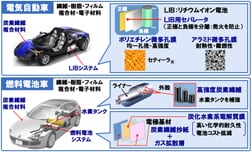 新エネルギーでは、リチウムイオン電池のセパレータ、燃料電池の電解質膜など、環境対応社会への布石を打ってきています。そのひとつが環境対応車への取り組みです。電気自動車は、リチウムイオン電池に充電した電気で走りますが、この電池の正極と負極の間に、火災を防止するため、セパレータという高分子膜が入っています。ここに当社のフィルム技術、ナノテクなどを駆使して、電気を通す微細な孔を、均一に形成したポリエチレン膜を開発し、生産を拡大中です。また、耐熱性・難燃性に優れたアラミド膜も研究中です。燃料電池車でも、燃料タンクである水素タンクの補強や、燃料電池の電極に炭素繊維が使用されています。また燃料電池の発電の心臓部である電解質膜も、当社独自の高分子膜を開発し、電池メーカーで評価中です。もちろん電池材料以外にも、炭素繊維をはじめ、繊維、樹脂、フィルムなど「車は東レの素材で進化する」を合い言葉に、自動車用先端材料の創出を、さらに加速していきます。